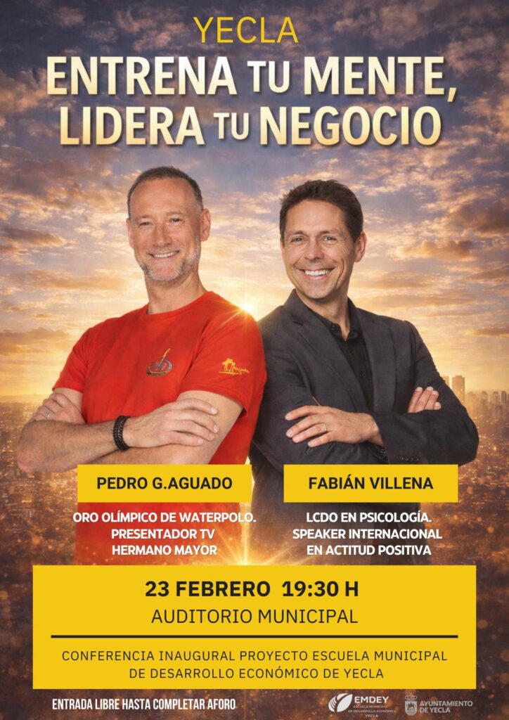 Pedro García Aguado, oro olímpico de waterpolo, presentador de televisión (‘Hermano Mayor’) y referente en superación; y el villenense Fabián Villena, psicólogo, conferenciante internacional y escritor bestseller, impartirán una conferencia a dúo con la que inaugurarán la Escuela Municipal de Desarrollo Económico de Yecla (EMDEY).