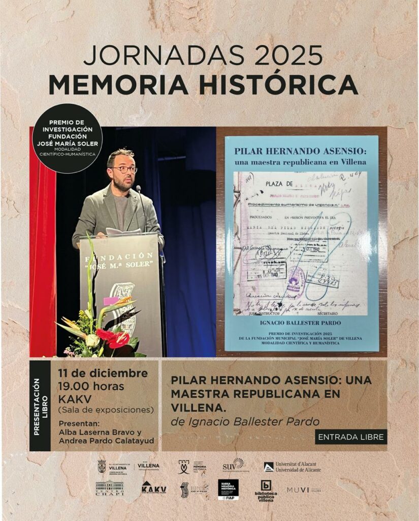 La concejalía de Memoria Histórica de Villena presenta el próximo 11 de diciembre el libro Pilar Hernando Asensio, una maestra republicana en Villena, obra de Ignacio Ballester Pardo, ganador del Premio José María Soler en la modalidad científico-humanística 2025. El acto tendrá lugar a las 19.00 horas en la sala de exposiciones de la segunda planta de La Kakv.