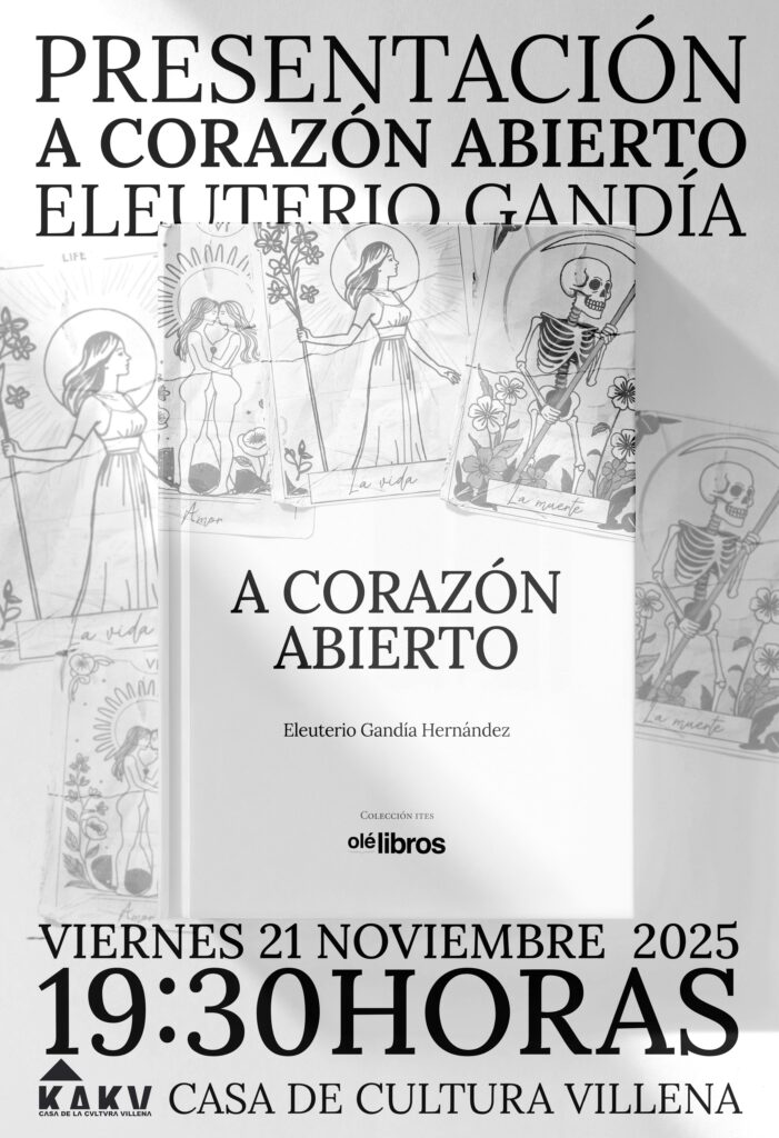 El próximo viernes, 21 de noviembre, a las 19:00 horas, la Casa de la Cultura de Villena (KAKV) acogerá la presentación del libro A corazón abierto, de Eleuterio Gandía, publicado por la editorial Olé Libros. El acto estará conducido por Ángel Luis Prieto de Paula, Jesús Herrero y Jordi Gandía.