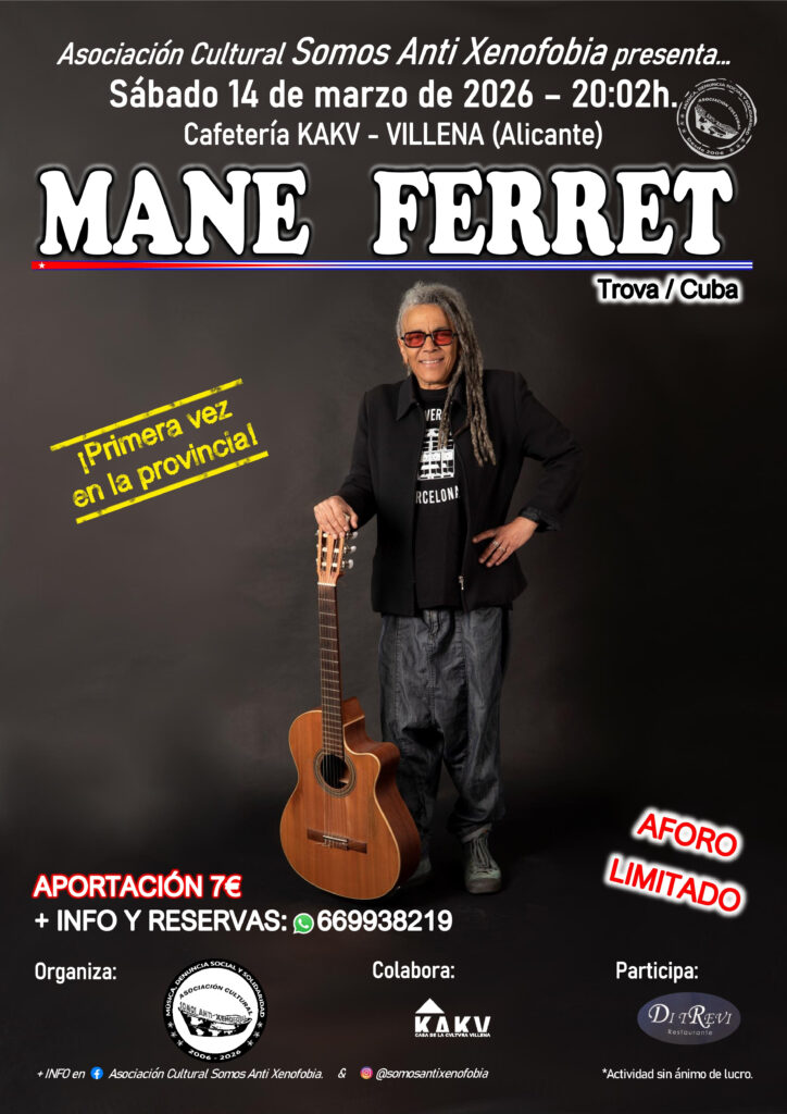En esta ocasión, la entidad presenta por primera vez en la provincia de Alicante a la cantante y compositora cubana Mane Ferret, en un concierto que tendrá lugar este sábado a las 20:00 horas en la Casa de Cultura de Villena.