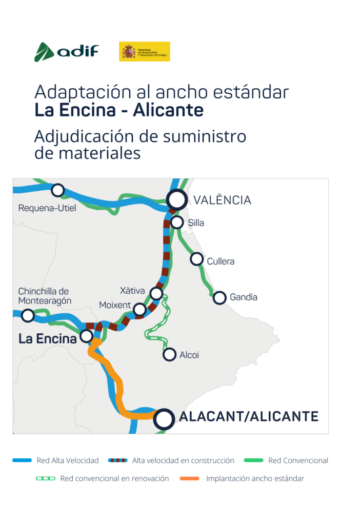 El Ministerio de Transportes y Movilidad Sostenible ha adjudicado por 23,9 millones de euros, a través de Adif, el contrato de transporte y suministro de nuevos materiales de vía para la implantación del ancho estándar en el tramo La Encina-Bifurcación de Alicante. Esta actuación forma parte del desarrollo del Corredor Mediterráneo en la Comunitat Valenciana.