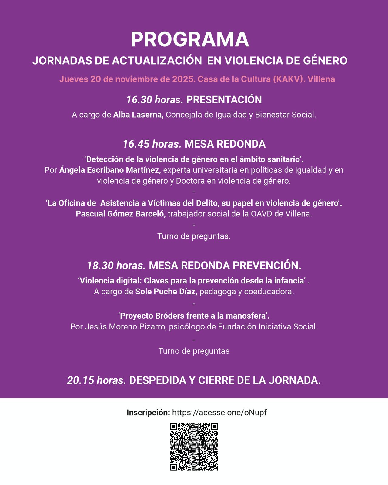 Durante la tarde se abordarán cuestiones clave como la detección de la violencia de género en el ámbito sanitario, el papel de la Oficina de Asistencia a Víctimas del Delito del Juzgado de Villena, la prevención de la violencia digital desde la infancia y las nuevas corrientes de radicalización machista en entornos juveniles. Las intervenciones correrán a cargo de profesionales como Ángela Escribano, Pascual Gómez, Sole Puche Díaz y Jesús Moreno, en una jornada moderada por la edil de Igualdad, Alba Laserna.