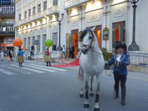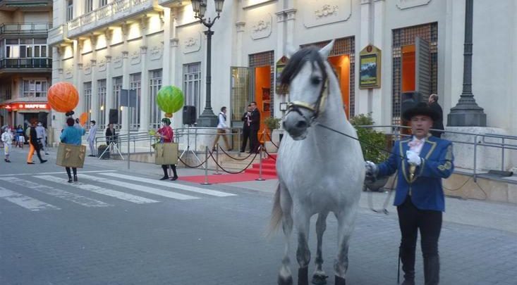Con el ambiente ya calentado por este cambio, llegaron las 7 de la tarde y los aledaños del Teatro Chapí se fueron llenando de público al mismo tiempo que las madrinas iban llegando al edificio junto a los directivos y cargos festeros. El espectáculo preparado para amenizar la espera es difícil de catalogar, y llamó poderosamente la atención: con juegos malabares combinados con arlequines y una doma de caballos se esperaba la llegada de las madrinas y finalmente de la Regidora Mayor acompañada del alcalde, Francisco Javier Esquembre.