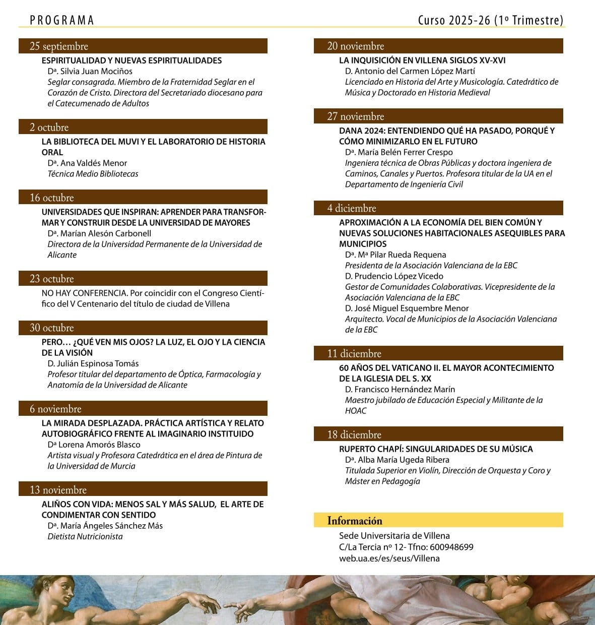 Por su parte, Esther Perales celebraba poder retomar una de las actividades más arraigadas de la Sede por su trayectoria y por la alta participación de público, con unos 100 asistentes a algunas de las charlas programadas, que ofrecen temas muy variados y dirigidos a todos los públicos, con preeminencia de la historia, tanto general como local, pero también con charlas sobre ciencia, música, economía, salud o religión.