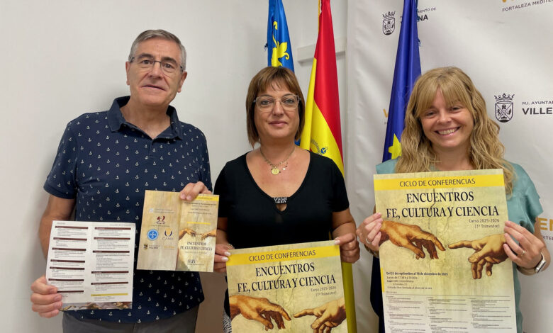 La concejal de Educación y Cultura, María Server, la directora de la Sede Universitaria de Villena, Esther Perales, y el representante del grupo Fe, Cultura y Ciencia, Ricardo Celiberti, han presentado el nuevo curso de este ciclo conferencias organizado por ambas entidades, cuyo primer trimestre da comienzo este 25 de septiembre y se prolongará hasta el 18 de diciembre. En esta ocasión, el ciclo contará con 12 conferencias que, como siempre, ofrecerán un amplio abanico de temáticas e intereses para todos los públicos.