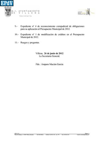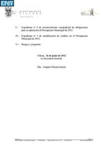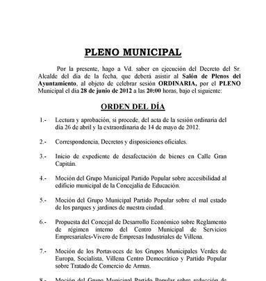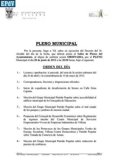 De hecho, y según el Orden del Día publicado por la Secretaría del Ayuntamiento, se trata de una sesión marcada por la total ausencia de iniciativas del equipo de gobierno. De los once puntos previstos para la sesión, podemos comprobar que tres son formalismos legales lectura y aprobación del acta de la sesión anterior, dar cuenta de la correspondencia y ruegos y preguntas, otros tres son mociones presentadas por el Grupo Municipal del Partido Popular accesibilidad en un edificio municipal, mal estado de los parques y jardines y reducción de cargos de confianza y un séptimo punto que, aunque aparezca presentado por las cuatro fuerzas políticas, es en realidad una petición de la agrupación local de Amnistía Internacional para que Villena se sume al Tratado sobre comercio de armas.