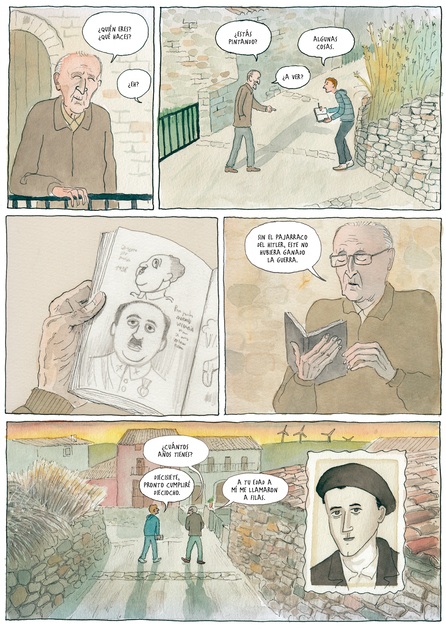 Por otro lado, si usted que me lee ahora prefiere obras más sujetas a la realidad y que presenten un cariz de índole histórico y social, su lectura ideal podría ser perfectamente Aquí donde estoy: basándose en la experiencia real de uno de los últimos supervivientes de la Batalla del Ebro, Gabriel León Honrubia, la guionista María Castro Hernández (que también ha dirigido un documental sobre el mismo asunto) y el dibujante Tyto Alba elaboran una novela gráfica cuyo argumento se desarrolla siguiendo dos líneas temporales reflejadas en paralelo: la de los años en los que aconteció la Guerra Civil y la de un tiempo presente en la que un adolescente entabla amistad con el anciano Gabriel y este le cuenta cómo con apenas dieciocho años se vio reclutado en las filas de la que después vino a llamarse por razones obvias la Quinta del Biberón del ejército republicano. El libreto se basa en las cartas -de las cuales el volumen recoge una nutrida selección a modo de material extra- escritas y conservadas por el propio protagonista, que falleció en 2021 con más de un siglo de vida a sus espaldas; y cuyo pasado (tanto el lejano como el más próximo) reviven con fuerza y emoción en el espléndido arte del autor de Whitman. Por tanto, estamos ante una de esas obras que, además de resultar entretenidas, son verdaderamente necesarias para que determinados sucesos del pasado no caigan en un injusto olvido y se cumpla así con la necesidad de disponer de una memoria histórica que evite repetir según qué sucesos. Muy recomendable, gustará a los seguidores de Paco Roca y a los admiradores de obras como El arte de volar o la misma Los surcos del azar.