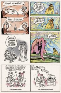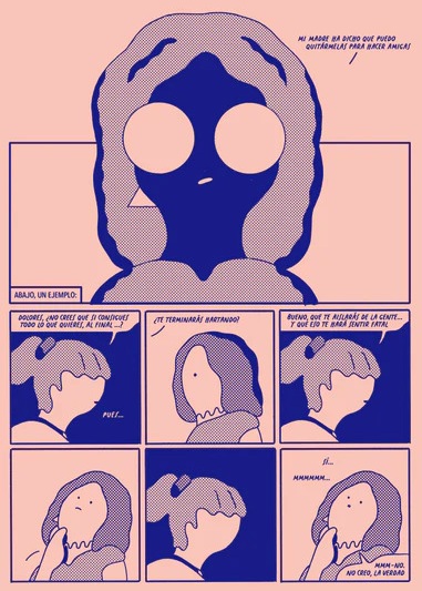 Otro de los mejores y más originales cómics españoles del año pasado fue sin duda Dolores, la novela gráfica que ha supuesto para muchos (yo incluido) el descubrimiento de un joven creador al que habrá que seguir con mucha atención: Eduardo Sabio. Ambientada la mayor parte a comienzos de los años dos mil y en el exclusivo complejo residencial al que los padres de su protagonista se acaban de mudar, esta es la historia de Dolores Madruga, una preadolescente a punto de cumplir los trece años que de la noche a la mañana descubre su propósito vital: convertirse en una estrella que todo el mundo reconozca y admire; para ello, trazará un plan que involucrará a familiares y amigos y que tendrá funestas consecuencias. Al margen del interés intrínseco del relato, lo que sorprende es el impactante desarrollo gráfico del mismo: en unas planchas que alternan bitono(s) y color y con una disposición de viñetas arriesgadísima que remite tanto o más al arte contemporáneo y al diseño gráfico que a la historia del propio cómic, el autor extremeño conjuga influencias varias del cómic de vanguardia. El más obvio es, lógicamente, Chris Ware; pero puede recordar también a otros autores contemporáneos tan radicales como Nick Drnaso, Dash Shaw, George Wylesol o Martin Panchaud; y a compatriotas como Ana Galvañ, Nadia Hafid, Candela Sierra, Marc Torices... o María Medem, a la postre autora del cartel de esta edición. En resumidas cuentas: una obra deslumbrante y que sin duda merece más predicamento del que tuvo en el momento de su aparición.