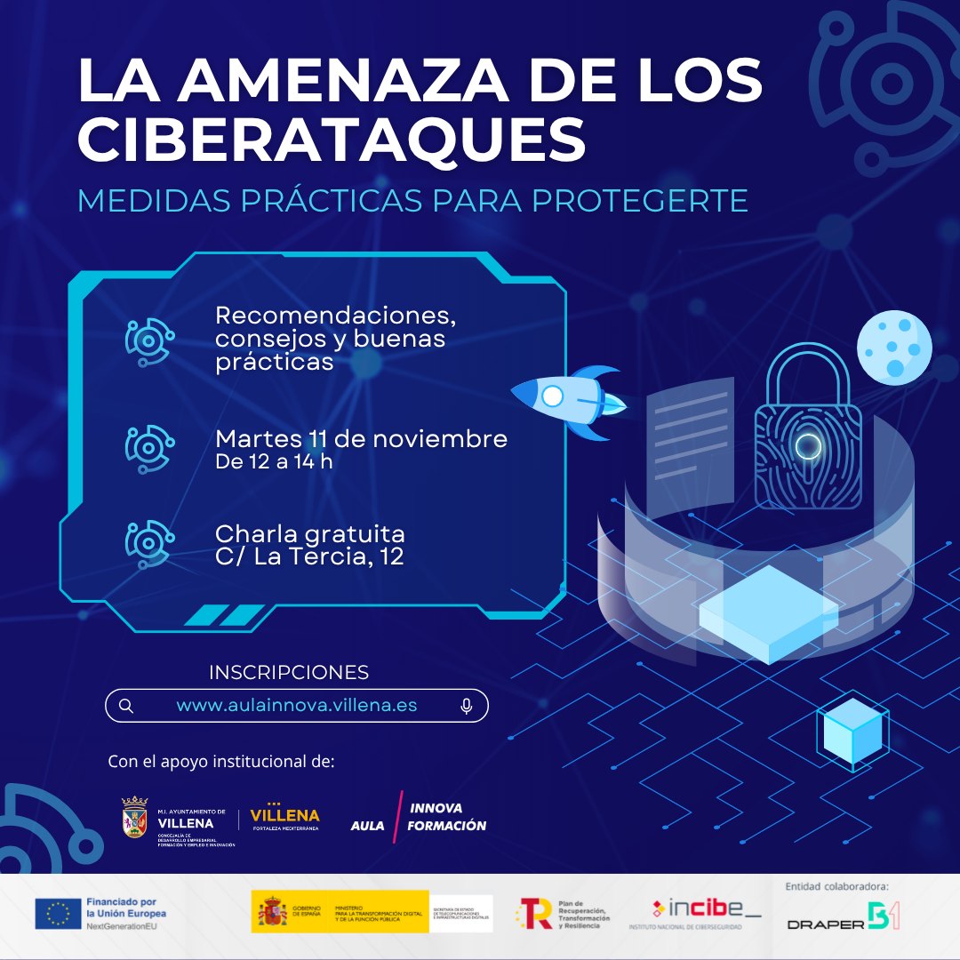 Este martes 11 de noviembre, Villena será sede de una interesante actividad formativa bajo el título “Ciberataques: medidas para protegerse”, una charla gratuita organizada en colaboración con el Instituto Nacional de Ciberseguridad de España (Incibe).