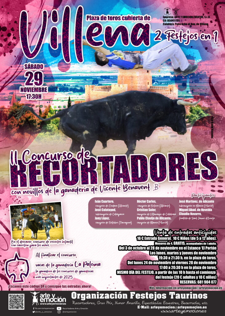 La plaza de toros de Villena acogerá el próximo sábado 29 de noviembre a las 17:30 horas el II Concurso de Recortadores, con novillos de la prestigiosa ganadería Vicente Benavent, y la suelta de vacas de la afamada ganadería La Paloma, triunfadora de los concursos de ganaderías más importantes de 2025.
