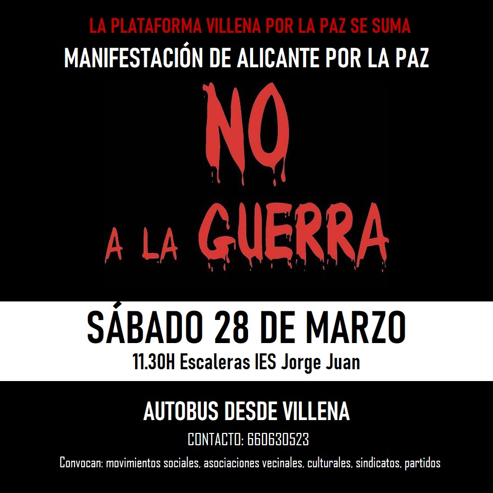 Desde la Plataforma Villena por la Paz se invita a ciudadanía a sumarse a esta manifestación que tendrá lugar en Alicante desde las 11:30 desde las escaleras del instituto Jorge Juan, Avda. General Marvá, y culminará en La Rambla, previo paso por Luceros y por la avenida Alfonso el Sabio. La manifestación, que tendrá el lema "No a la guerra, Alacant per la pau", se realiza una semana después de la que se ha celebrado en València, con motivación idéntica.