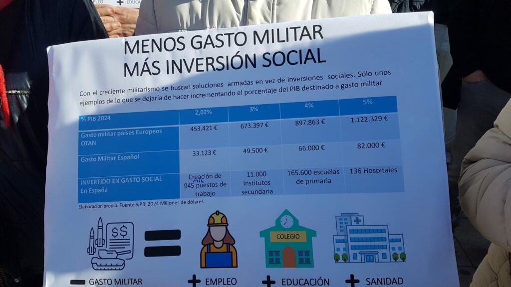 En una mañana soleada, desde las 11:30 personas unas 60 personas afines a la plataforma pacifista Villena por la Paz fueron concentrándose en la avenida de la Constitución desplegando, junto a su habitual pancarta en contra del genocidio en Gaza, carteles alusivos al incremento de los gastos militares y al gran número de guerras vigentes. En ellos se podían ver la distribución geográfica de los conflictos y las equivalencias entre el dinero dedicado a armamento y las posibles inversiones en necesidades sociales.