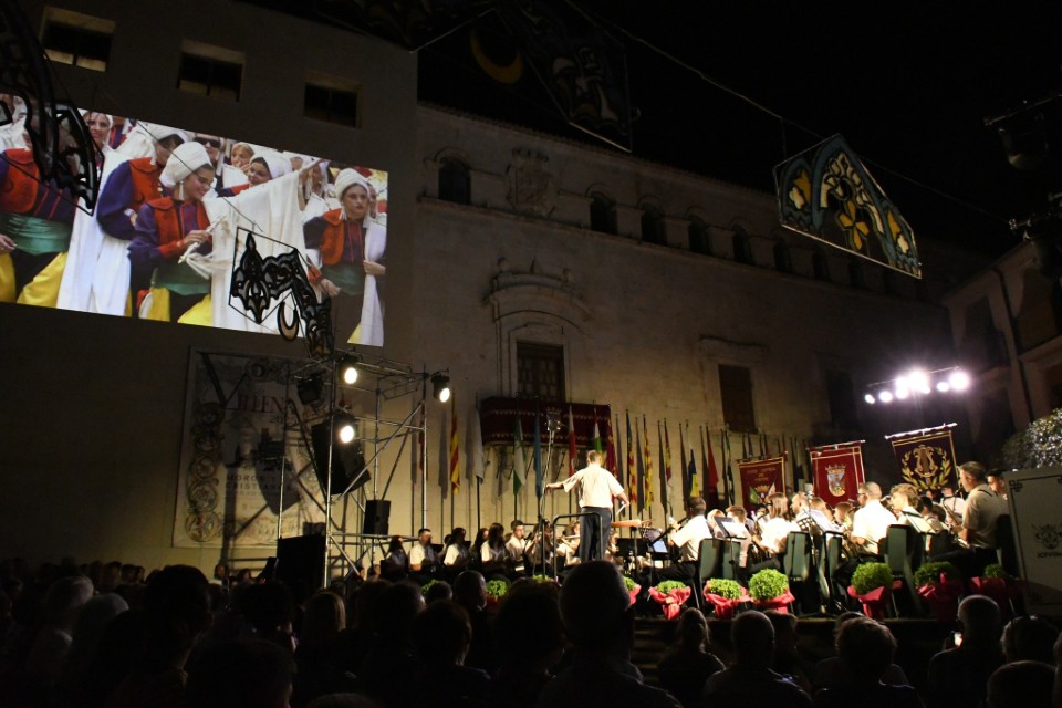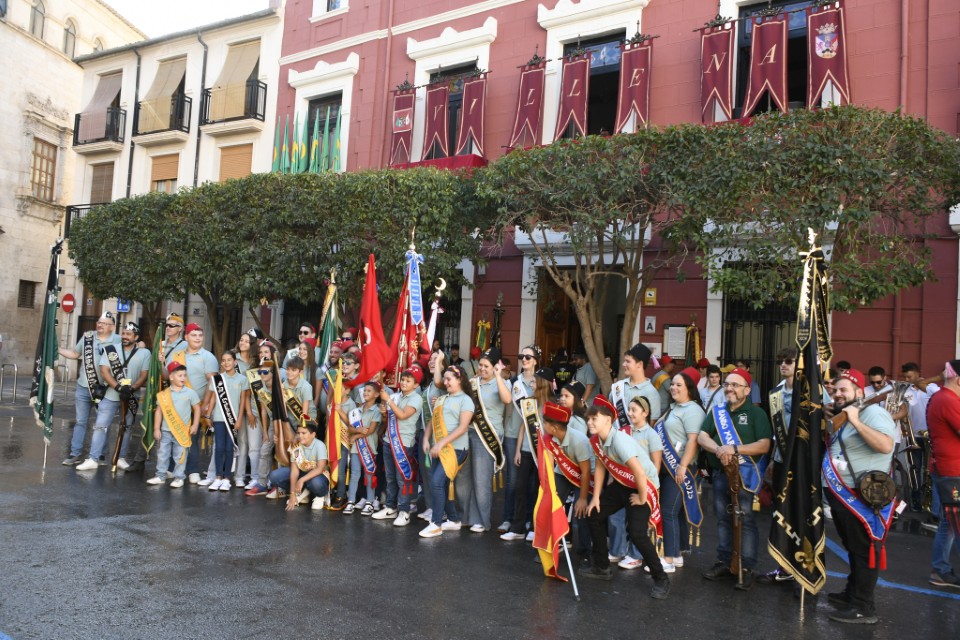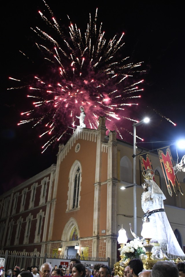 Acto seguido, la Patrona continuó su camino, precedida por los arcabuceros de las catorce comparsas, a hombros de los ciudadanos, marchando a continuación las Camareras de la Virgen, las autoridades religiosas, las Regidoras Mayor e Infantil y la Corporación Municipal.